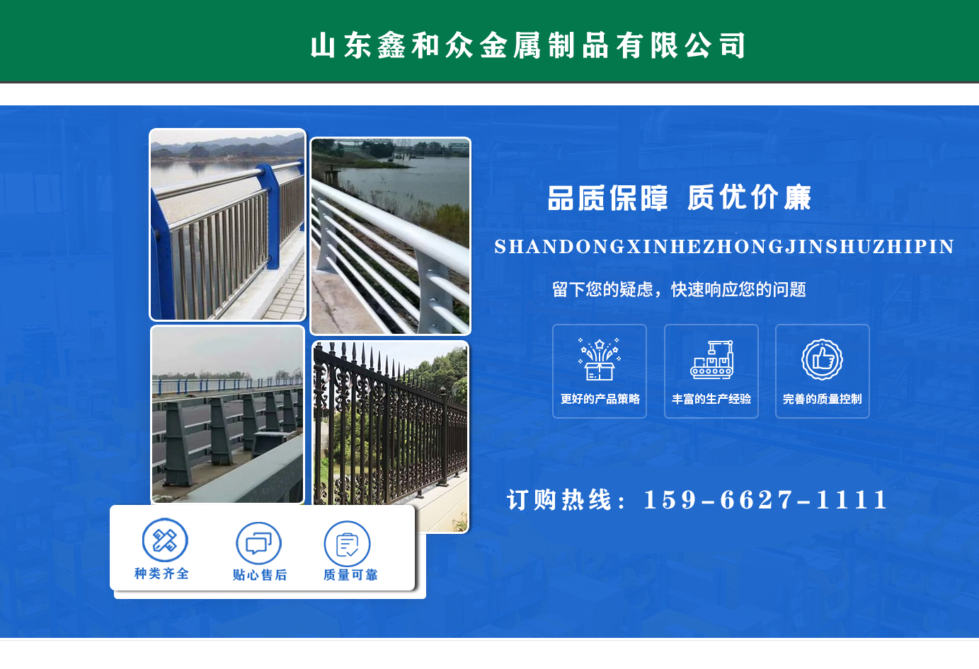 山東鑫和眾金屬制品有限公司主要產(chǎn)品有防撞護(hù)欄,橋梁護(hù)欄,道路護(hù)欄,河道護(hù)欄,不銹鋼護(hù)欄等護(hù)欄。提供設(shè)計(jì)方案,一站式定制,包您滿意價(jià)格優(yōu)惠,歡迎來電咨詢! 公司常年從事銷售護(hù)欄防撞護(hù)欄,橋梁護(hù)欄,道路護(hù)欄,河道護(hù)欄,不銹鋼護(hù)欄,橋梁鋼護(hù)欄,河道燈光護(hù)欄等。產(chǎn)品廣泛應(yīng)用于橋梁、河道、旅游景區(qū)、道路、公路、公園、小區(qū)、景觀、道路防撞等領(lǐng)域。 公司產(chǎn)品均采用優(yōu)質(zhì)不銹鋼材料,符合相關(guān)標(biāo)準(zhǔn)。各種型號(hào)不銹鋼復(fù)合管及護(hù)欄,質(zhì)量嚴(yán)格把控。產(chǎn)品強(qiáng)度高、耐腐蝕、焊接牢固、抗沖擊、性能好,防撞護(hù)欄結(jié)構(gòu)簡單、美觀實(shí)用大方。 歡迎前來訂購!...